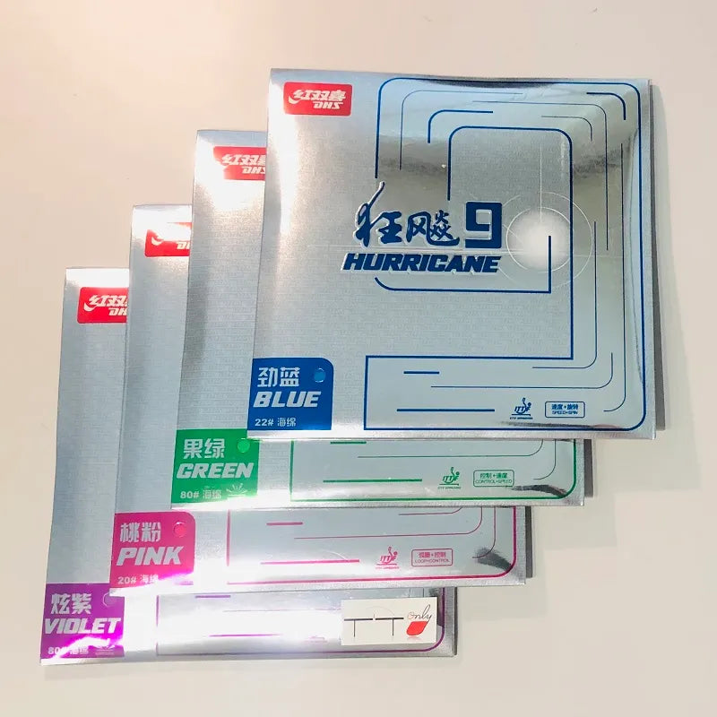 The DHS Hurricane 9 is a high-performance table tennis rubber designed for players seeking a balance between spin, speed, and control. Known for its versatility, it comes with different color variants, each offering unique sponge properties that affect the rubber's performance, such as enhanced power, speed, or responsiveness.