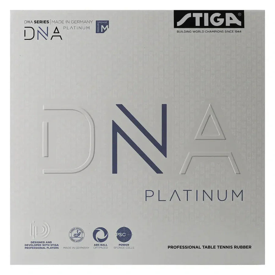 The Stiga DNA Platinum M is a high-performance rubber crafted for offensive players seeking a perfect harmony of speed, spin, and control. Designed in collaboration with top players and manufactured in Germany, this rubber features a medium sponge (47.5°) that delivers dynamic power while retaining a forgiving touch.